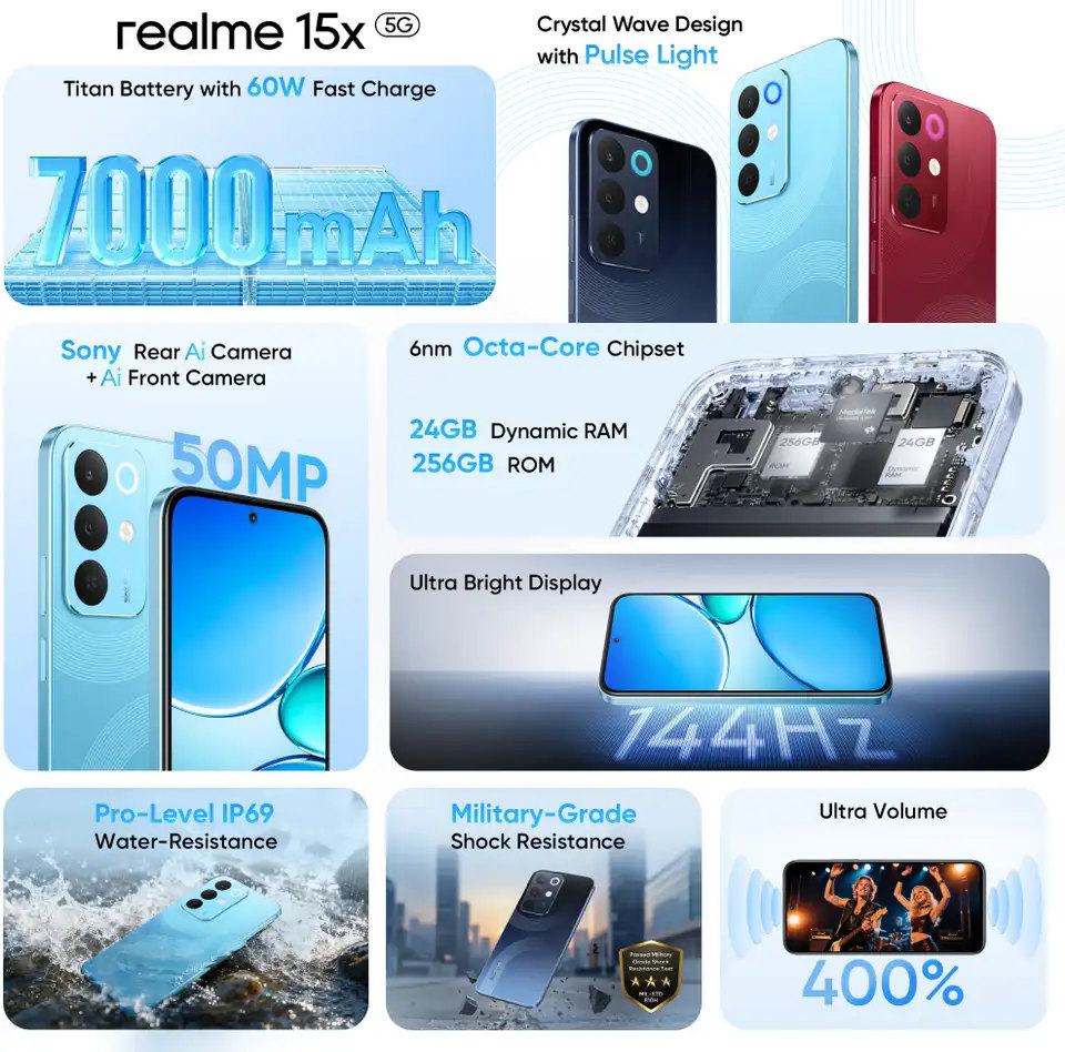 Durability is another key highlight. The realme 15X 5G carries both IP68 and IP69 certifications for dust and water resistance, along with MIL-STD 810H military-grade shock resistance. For audio, the phone includes a bottom-firing Ultra-Linear speaker that supports “400% Ultra Volume” amplification.