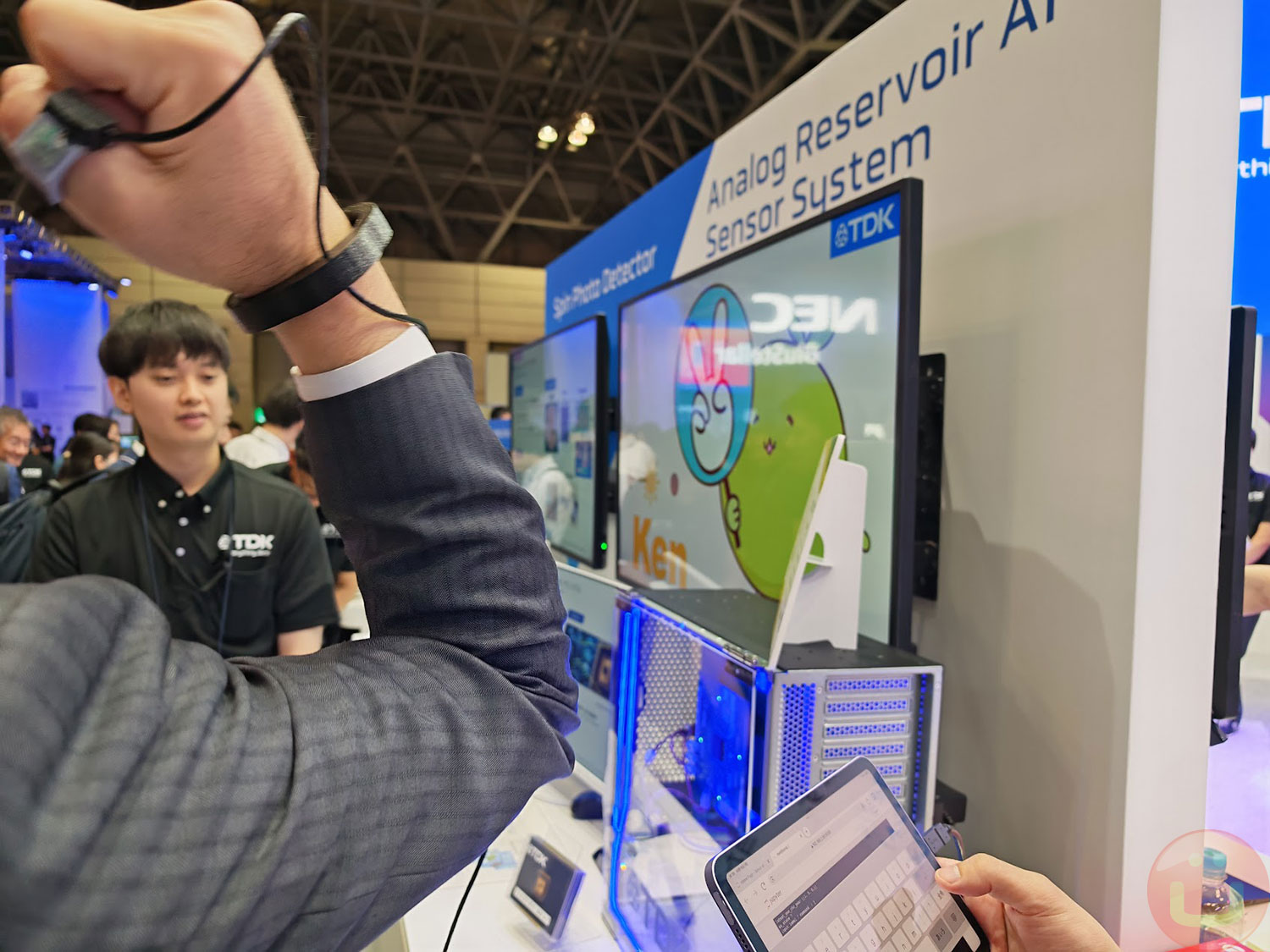 At CEATEC 2025, TDK showcased an engaging demo using its analog reservoir AI chip and acceleration sensors. The setup featured a display showing the game, a lightweight sensor on the participant’s arm, and the prototype chip processing motion data in real time.As I began to move my fingers to form rock, paper, or scissors, the system measured my finger acceleration and trajectory. The analog circuit instantly processed the data stream and predicted my intended gesture, displaying its countermove before I could finish. The sensation was uncanny — as if the system had read my mind — yet it was purely responding to motion patterns faster than any human reaction time.