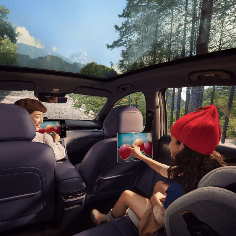 The cabin integrates HarmonyOS, highlighted by a 15.6-inch central display, digital driver panel, 50W wireless fast charging, customizable ambient lighting, a panoramic sunroof (24.7 sq ft), and reclining rear seats.